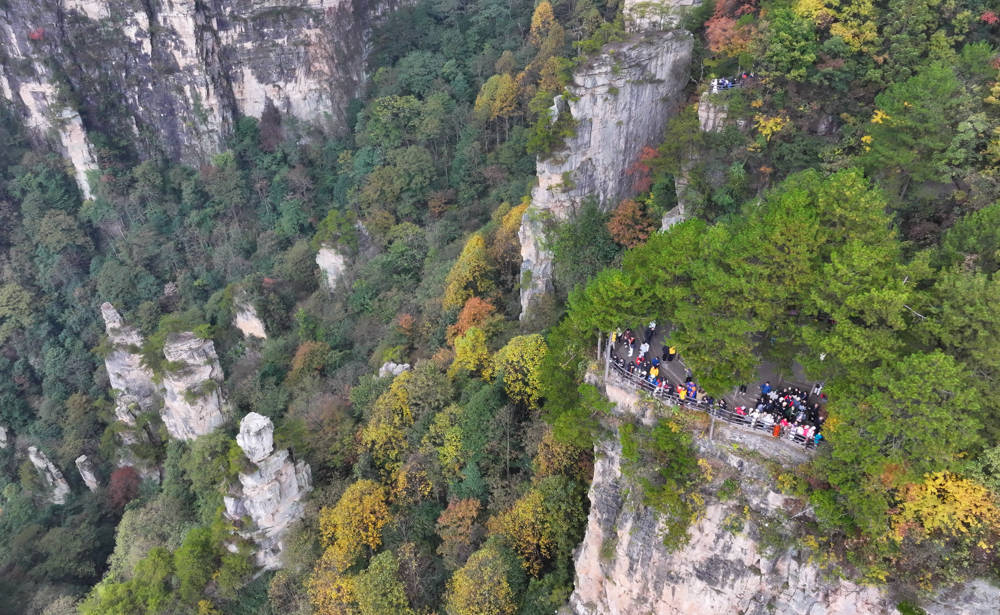 ↑2025年11月4日,游客在湖南张家界国家森林公园天子山景区观光游览。(无人机照片)CICPHOTO/吴勇兵 摄编辑:张雪萌