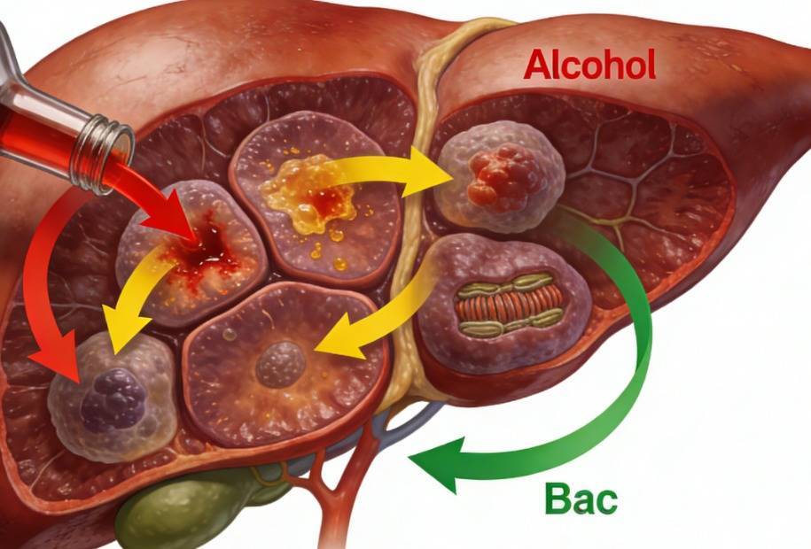 酒精在肝脏内先转化为乙醛 —— 这是明确的致癌物质,会直接损伤肝细胞的细胞膜和 DNA;再转化为乙酸,最终分解成二氧化碳和水排出。肝脏代谢能力有限,一旦饮酒量超标,乙醛就会在体内堆积,短期大量饮酒可能引发酒精性脂肪肝;长期饮酒则会让脂肪肝发展成酒精性肝炎,进一步恶化就是肝硬化,甚至肝癌。