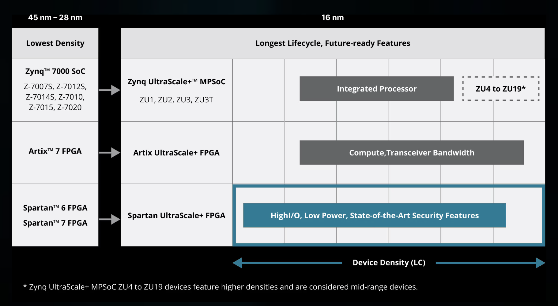 这一产品组合中的最新产品就是AMD Spartan UltraScale+ FPGA,其专门为降低功耗、成本、保持高性能而设计,且还会提供灵活的I/O、PCIe接口、集成内存和系统监控。同时,AMD还提供了不同的架构,使企业能够根据不同的应用场景在尺寸、功能之间灵活选择。