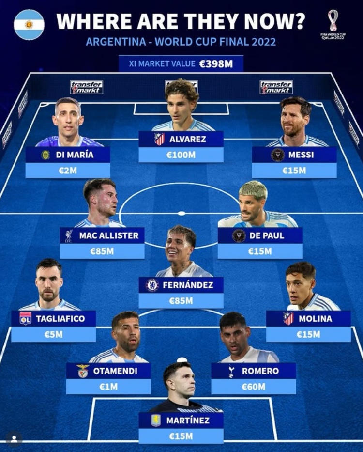阿根廷在3年前的今天赢得了世界杯冠军,《转会市场》也追踪了阿根廷决赛首发11人的当前情况。